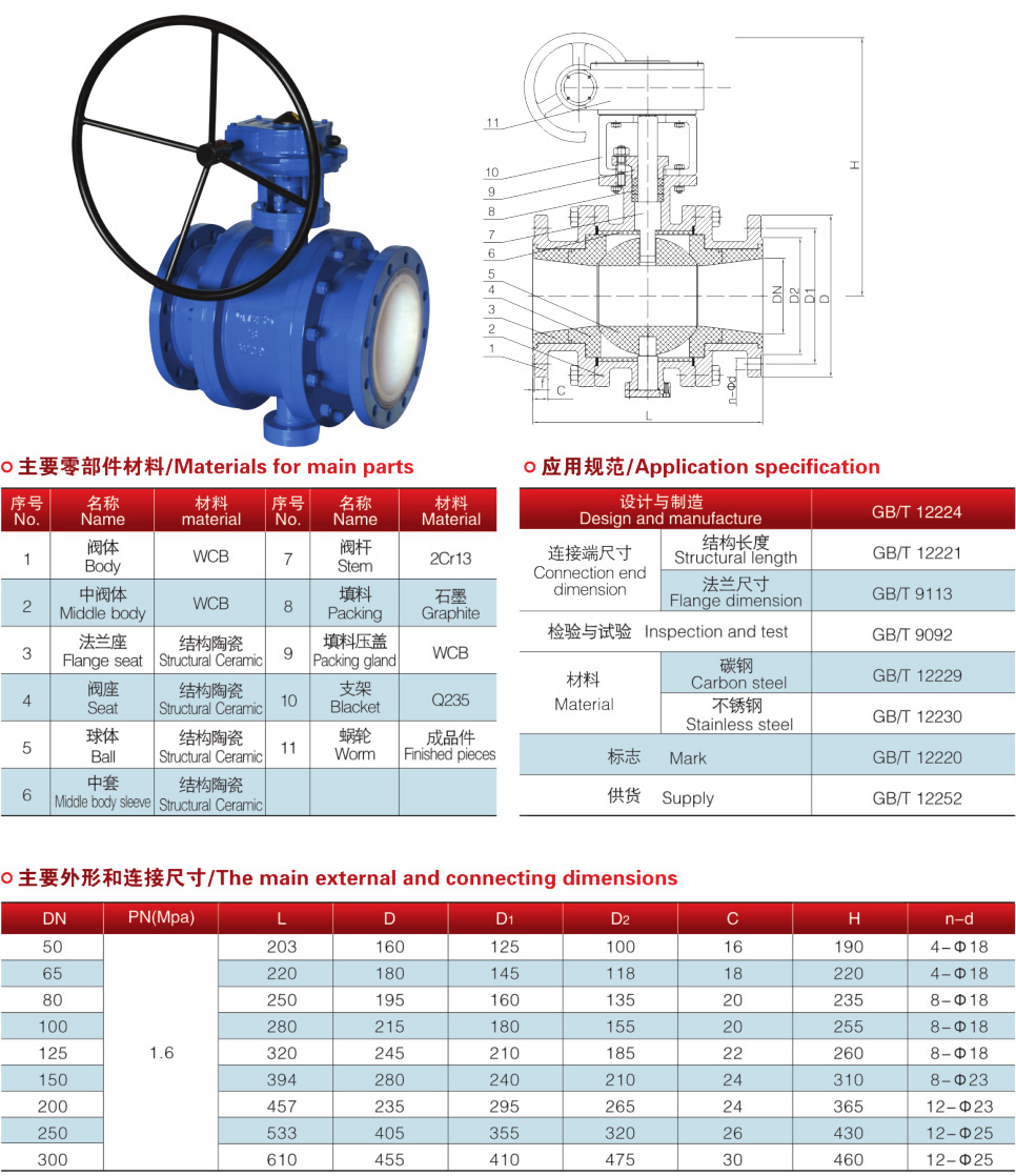 球体采用研磨设备及工艺制造,球圆度精度高、表面质量好、与阀座对研后,利用结构陶瓷的自滑润性,具有很好的密封性能。彻底改变了金属硬密封球阀易泄露、扭矩大、密封面不耐腐蚀的缺点。阀座、球体具有良好的耐磨性、使用寿命长,是钛合金阀和蒙乃尔阀的2-4倍。本阀为三片式结构,可按照GB、JIS、 API等标准数据制造。