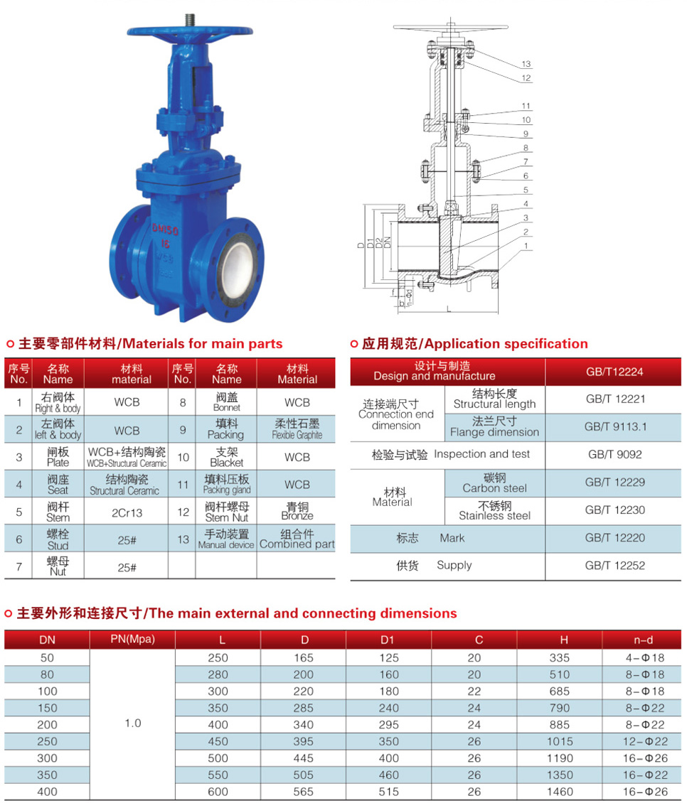 本阀主要由阀体、闸板、支架、丝杆、工程陶瓷等组成。手轮采用推力轴承设计,减小了启闭阻力;也可根据阀体易磨损部分使用抗磨材料复合而成,出口流线型设计使用过程不结渣,可采用电动、手动等控制方式。耐磨排渣阀适用于燃煤电厂除灰渣系统的专业阀门,亦可用于矿山洗矿管道、选煤系统、化工系统中磨损管道。尤其是面对高磨损、强腐蚀、高温、高压等恶劣工况,陶瓷阀更显示出它的性能。