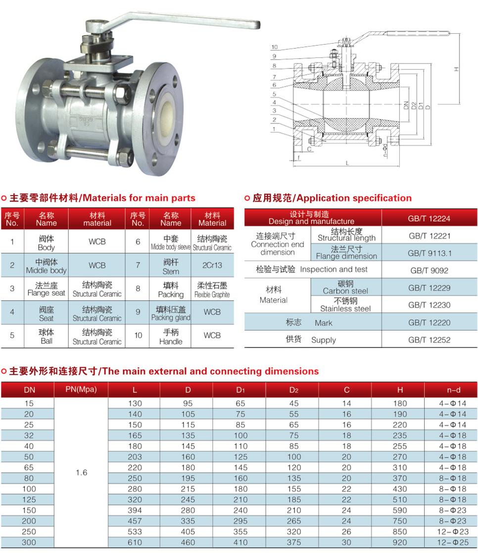 球体采用研磨设备及工艺制造,球圆度精度高、表面质量好、与阀座对研后,利用结构陶瓷的自滑润性,具有很好的密封性能。彻底改变了金属硬密封球阀易泄露、扭矩大、密封面不耐腐蚀的缺点。阀座、球体具有良好的耐磨性、使用寿命长,是钛合金阀和蒙乃尔阀2-4倍。本阀为三片式结构,可按照GB、JIS. API等标准数据制造。