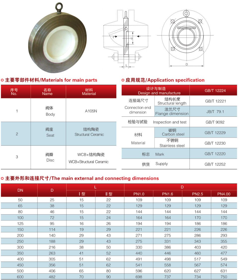 陶瓷止回阀是防止介质倒流的自动阀门,流体从进口侧流向出口侧。止回阀的阀瓣在流体压力的作用下开启,介质倒流时靠阀瓣的自重或辅助机构自动关闭,以防止介质倒流保护设备的正常运行。该产品的阀瓣、阀座密封面的材料均采用结构陶瓷制造,提高了阀门的耐磨性与而冲刷性,大大地延长了使用寿命。该产品在阀座上设有防止冲击的结构,以保护阀座抗冲击性。
